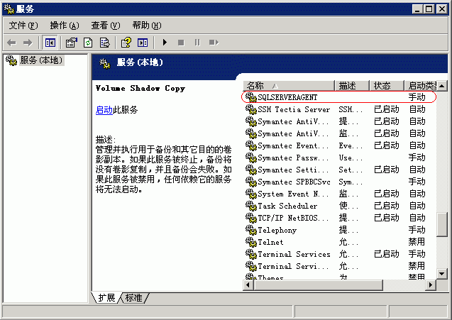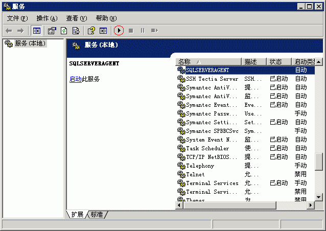 •     首先,我们远程登陆服务器,先开启"SQLSERVERAGENT"服务,点击开始---程序---管理工具---服务,并在“服务”中开启